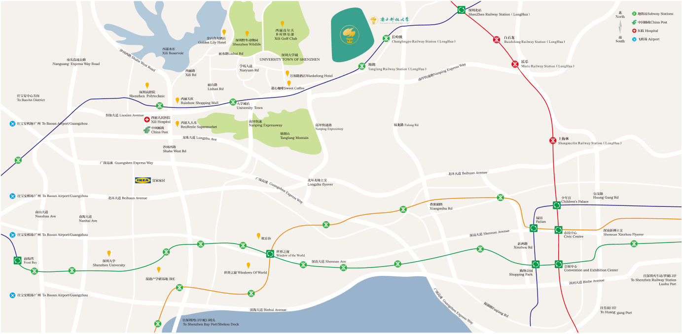 Subway: From Terminal 3 at Shenzhen Bao'an International Airport, take the #11 Line subway to Qianhaiwan Station. At Qianhaiwan Station, change to the #5 Line subway to Tanglang/SUSTech. The ride should take about 60 minutes.