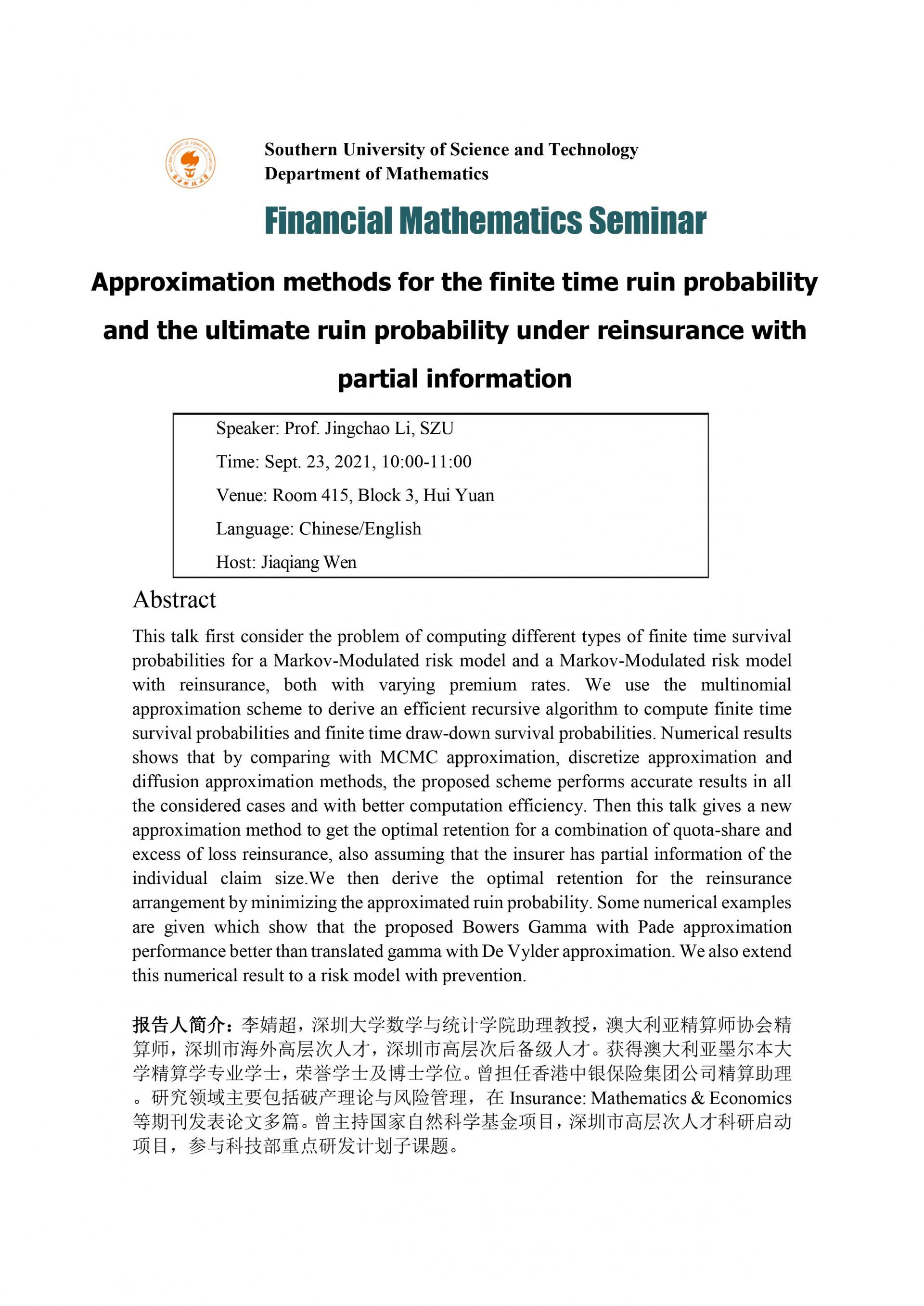 Approximation methods for the finite time ruin probability and the ultimate ruin probability under reinsurance with partial information